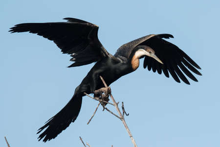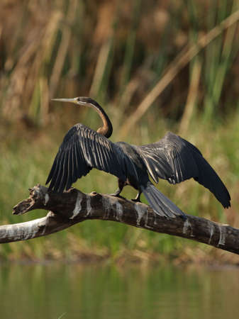 African Darter (Anhinga melanogaster rufa) spreads his wings to dry. Taken in the Okavango Delta, Botswana