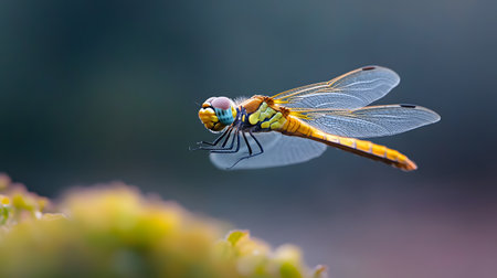 A vibrant dragonfly hovers midair with intricate wings outstretched. The shallow depth of field creates a soft, dreamy background.