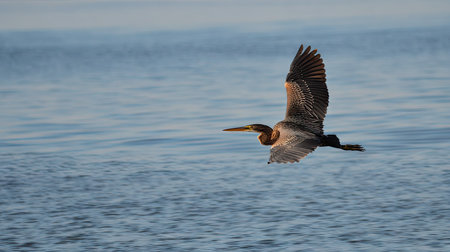 A dark-colored bird is captured mid-flight against the backdrop of a vast, calm body of water. The composition highlights the bird's outstretched wings and streamlined body. The image showcases soft lighting and a blurred background, which creates a sense of freedom, suitable for nature and travel content.