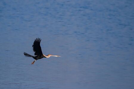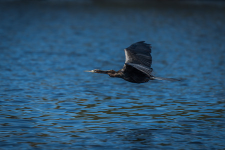 An oriental darter also called Indian darter in a low flight with wings open and water in the background in Rajasthan India