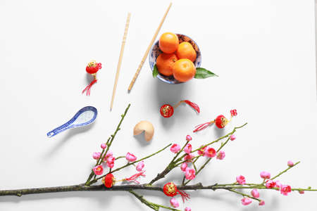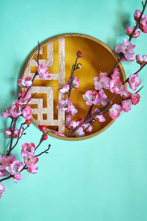 Top view of Chinese lunar new year background copy space design concept with white plum blossom and festive decoration, the word inside picture means blessing.