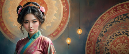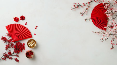 chinese new year background, asian style doll and flower fan, copy space, place for text