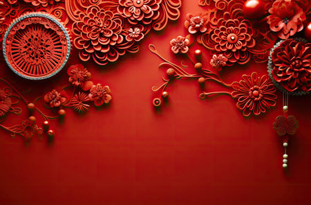 Chinese New Year Decorations in Red and Gold Featuring Lanterns, Flowers, and Ornaments. Concept of Festive Celebration, Cultural Tradition, Holiday Decor, and Vibrant Aesthetics. Background.
