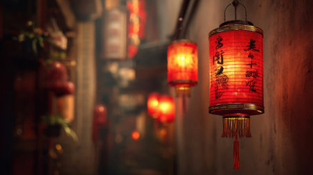 Decorative red lanterns hanging against a warm light. Vertical composition (9:16) capturing the full