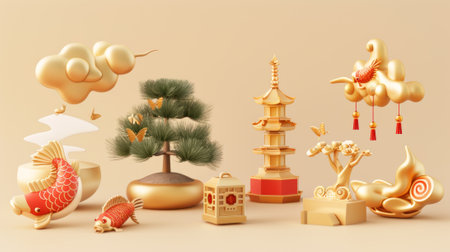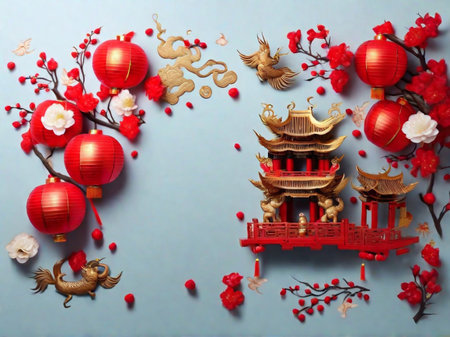 Chinese New Year Traditional Red and Gold Decorations Celebrating Prosperity and Fortune - Lanterns, Flowers, and Dragons Illustration. Background.