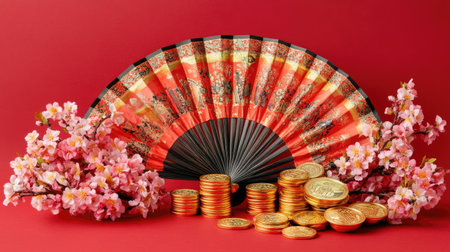 Two red fans rest beside pink cherry blossoms, creating a cultural scene. The dark background highlights the colors. The setting is suitable for a Japanese theme or celebration.
