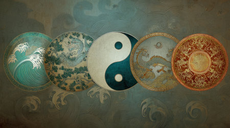 Feng Shui Scene with Bagua Mirrors, Chinese Coins, and Water Fountains on a Wooden Background AI