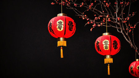Serene scene of cherry blossoms in bloom against a warm red background, featuring traditional lanterns hanging amidst delicate petals. Harmony and tranquility concept.