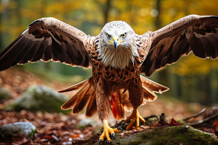A stunning bird of prey captures attention in mid-flight against a backdrop of colorful autumn foliage, showcasing the beauty of nature and wildlife.