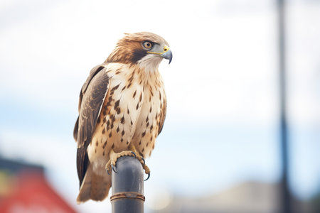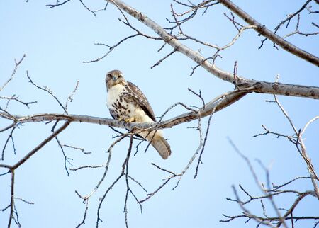 red-tailed hawk or Buteo jamaicensis in front view, in Coaldale, Alberta - bokeh background