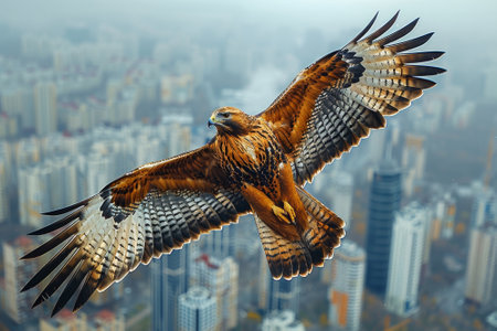 A powerful hawk glides gracefully through the sky, its wings spread wide, as it overlooks a bustling city filled with towering skyscrapers..