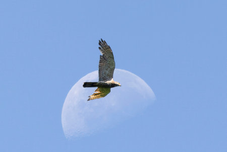 A juvenile grey-lined hawk soaring in the blue sky. Bird in flight. Wildlife in nature. Raptor hunting for food.