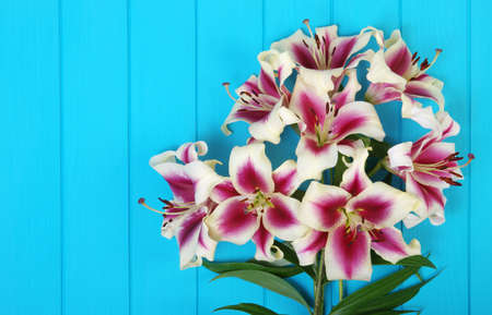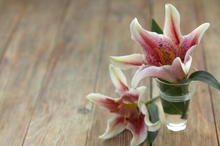 beautiful colorful lily flower bouquet on rustic wooden background. gorgeous bloom lilies on rustic wood backdrop. space for text. greeting card. spring holiday, woman mother day