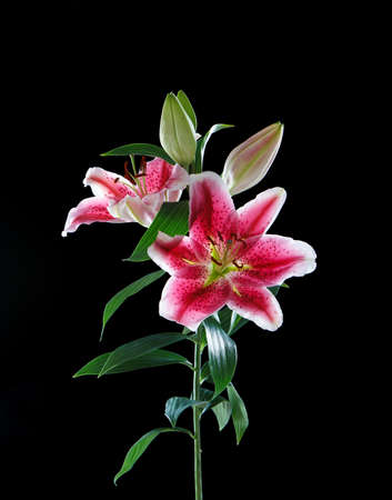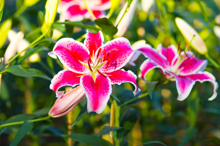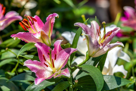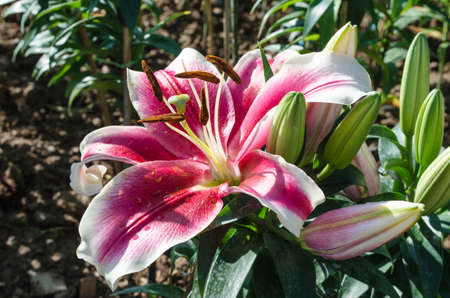 Pink and White Asiatic Lily, Lilium auratum, growing in a beautiful garden