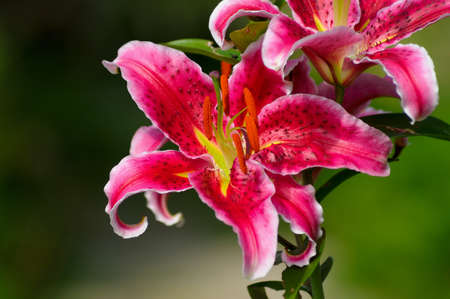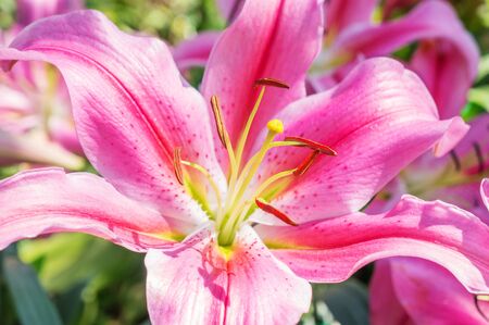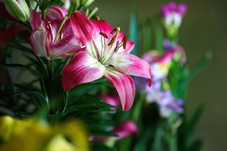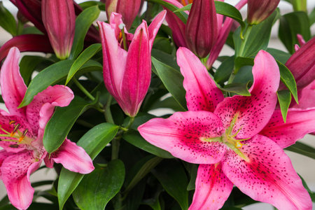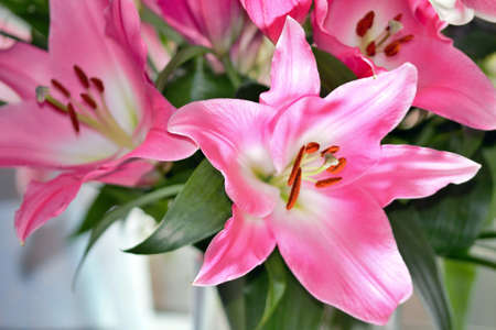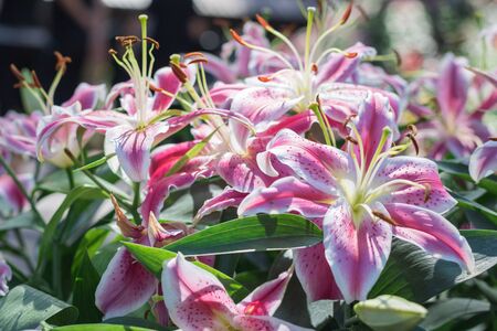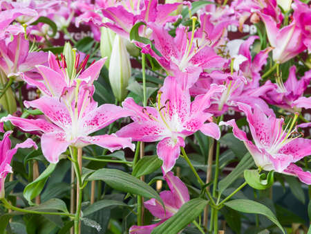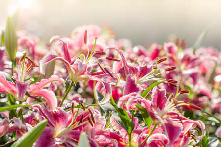 Close-up of vivid pink lily flowers bouquet with aromatic fragrant are blooming in the soft morning sunlight.