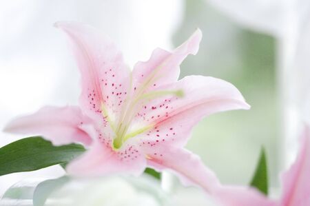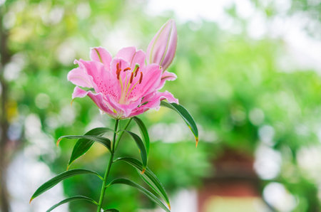 Pastel pink Lily flower in garden. Beautiful Lily flower over blurred green background. Floral background of bloom asian lily in summer in flower garden