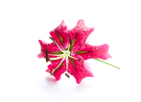 Pink blooming Lilium flower stem in a glass vase studio shot isolated on white.