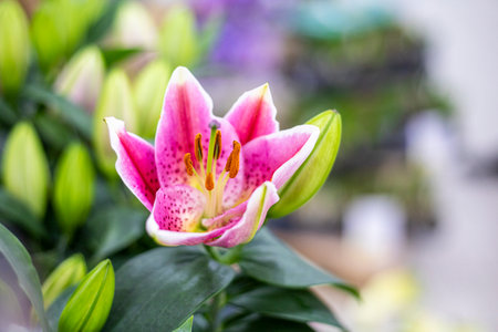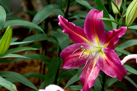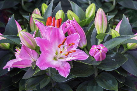 group of fresh pink violet lily flower buds and blooming with green leaves in botany garden natural park