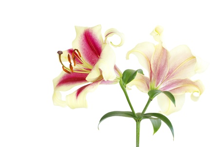 Branch of a red Lily with two large flowers on a white isolated background. Side view