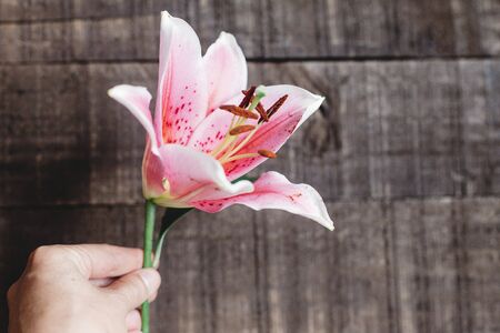 pink lily flower in hand on rustic wooden background. gorgeous bloom on rustic wood backdrop. space for text. greeting card. celebration concept. unusual