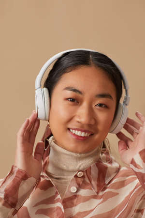 Portrait of Asian young woman in wireless headphone listening to music and smiling at camera
