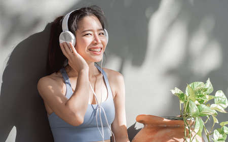 Portrait of asian healthy and sportive woman wearing sport bra and listen music at cozy home.