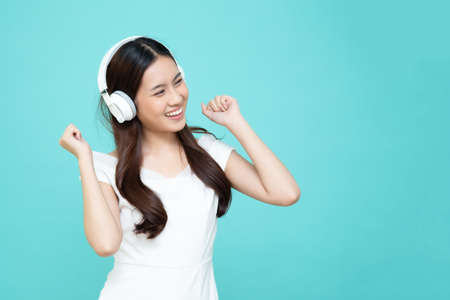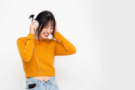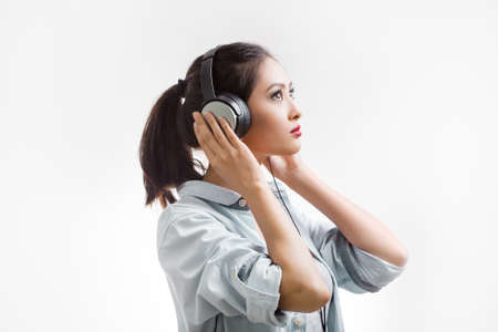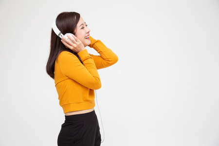 Pretty asian girl listening music with her headphones on white background