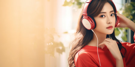 Beautiful asian woman listening to music with red headphones at home.