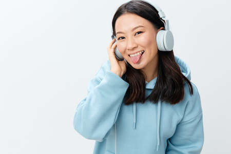 Funny happy pretty Korean young female in blue hoodie headphones sticks tongue out at camera posing isolated on over white studio background. The best offer for ad. Music App Platform Ad concept
