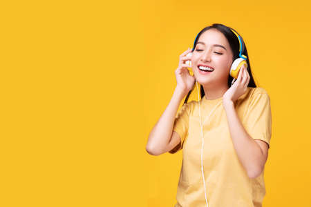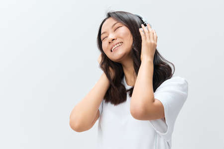 Relaxing happy cute Asian young female in white basic t-shirt touch headphones closing eyes posing isolated on over white studio background. The best offer for ad. Favorite Music App Ad concept