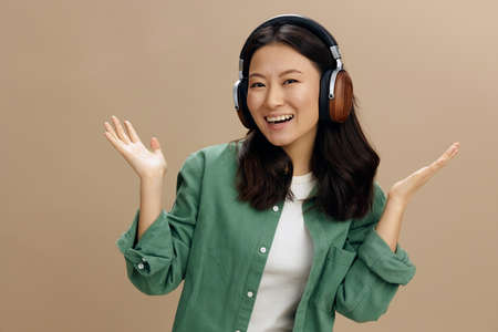 Hey look here. Cheerful happy Asian young woman in khaki green shirt headphones raise palms up posing isolated on over beige pastel studio background. Cool fashion offer. Music App Platform Ad concept