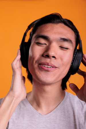 Young asian man listening to music, enjoying song in wireless headphones with satisfied facial expression, close view. Smiling relaxed teenager wearing earphones closeup on face