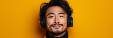 The image features an Asian male with headphones, exuding a sense of contentment , celebrating the simple pleasures of life and the power of music, banner