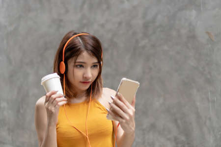 Enjoys and smiles of young woman wear listening music with orange earphones her hand holding cup coffee.