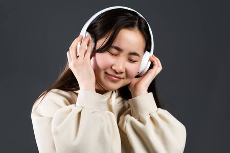 Cute asian teenager listening to music with headphones. Portrait of millennial pretty girl with long hairstyle on grey background