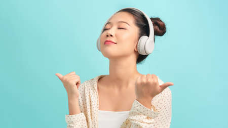 Beautiful asian woman with headphones listening to music in the room