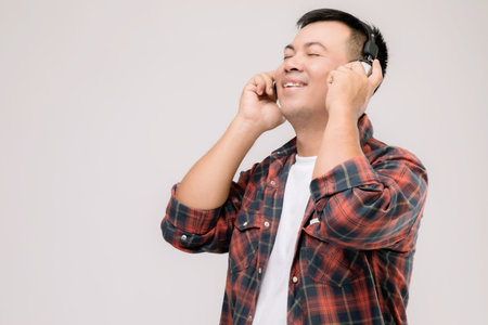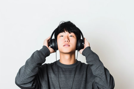 Young Asian man wearing headphones on a white background listening to his favorite music.