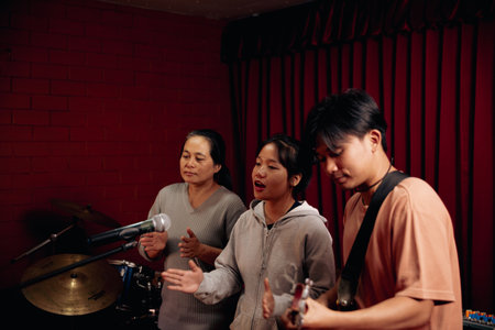 Performers in colorful traditional clothing are singing joyfully on stage, highlighting cultural heritage and musical expression in a lively festive atmosphere, AI generated