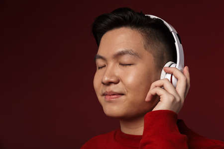 Image of joyful young asian man smiling while using wireless headphones isolated over burgundy background