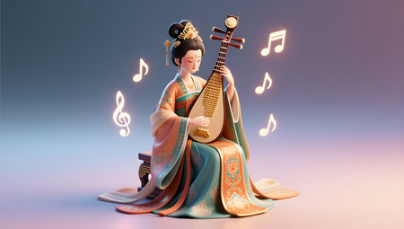 3D Illustration of a Japanese Geisha with a musical instrument