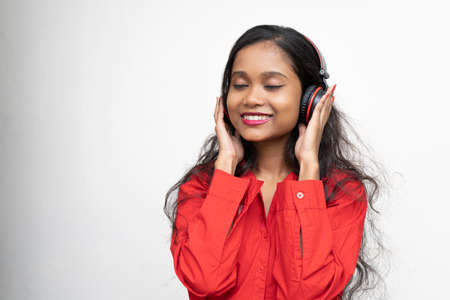 Young charming girl in red shirt listening to songs in her headphones. White background and copy space.