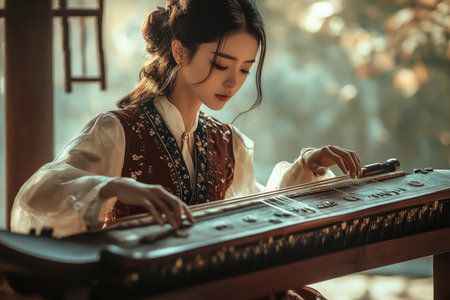 A musician focuses intently while playing a traditional string instrument in a serene outdoor environment at sunset.