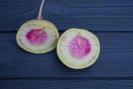 Fresh sliced organic radish vegetable on a grey concrete broard