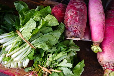 Organic white radish or Chinese radish in on wooden background