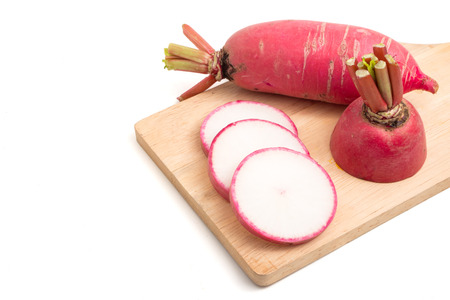 Fresh Pink Radishes on wooden tray over white background.