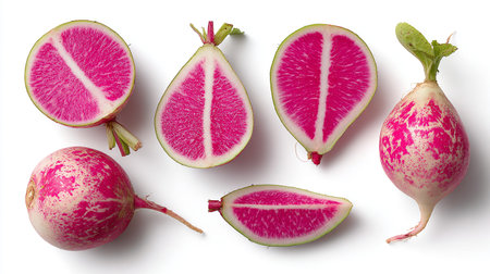 top view of cut raw purple fresh watermelon radish on white background