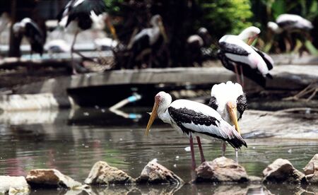 A group of painted storks drinking water and sunbathing in summers in a bird sanctuary