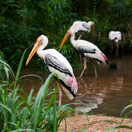 Big Painted Stork Flock resting near the pond in the Rain Forest, Thailand