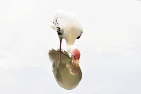 White stork with a red beak in water