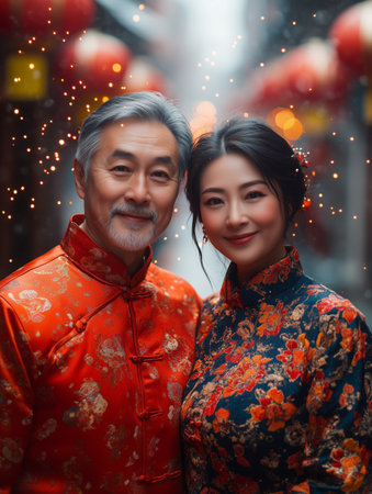 A vertical, full-body shot of an East Asian father and his adult daughter in traditional LNY attire,